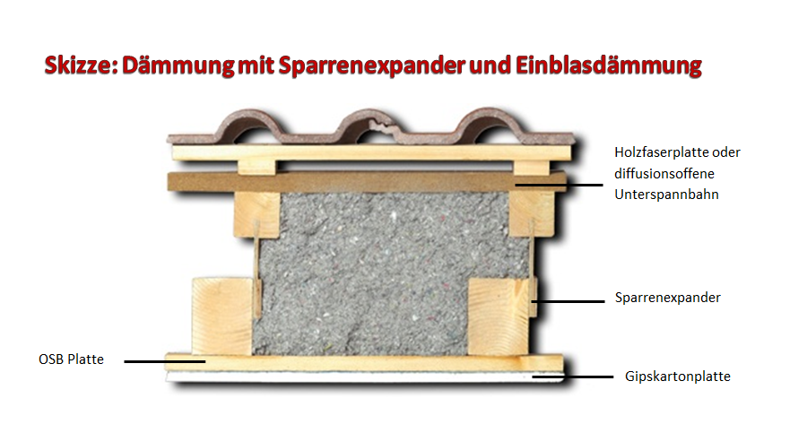 Schaffung eines zusätzlichen Raumes für die Anbringung von Dämmstoffen zwischen Sparren und Dacheindeckung, einen sogenannten „Dämmraum“. Dieser wird dann mit Einblasdämmstoffen verfüllt: Die Fa. Hufer Holztechnik hat vor ca. 18 Jahren den Sparrenexpander erfunden. Ein Sparrenexpander ist ein sehr dünner T-Träger aus Holz. Da der Steg so dünn ist, kann der Holzanteil für die Berechnung der Dämmwirkung vernachlässigt werden. Dieser T-Träger wird seitlich an den Sparren befestigt. Die Oberseite wird mit einer diffusionsoffenen Folie (oder Holzfaserplatten) ausgelegt. Anschließend wird auf diese Folie (oder Holzfaserplatte) und den Sparren ein Kantholz geschraubt. Auf diesem erfolgt wiederum die Konterlattung und zuletzt die Dacheindeckung. Gegenüber der herkömmlichen Aufsparrendämmung hat die Dämmung mit Sparrenexpandern folgende Vorteile: