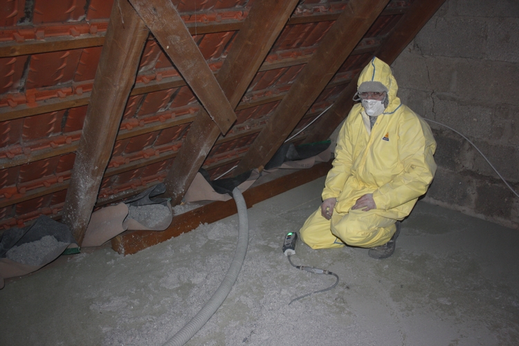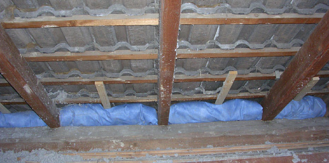 Die Dämmsäcke sind fachgerecht in die Dachschrägen eingebracht und werden nun befüllt. Im Vordergrund befindet sich der alte Dämmstoff, der zuvor in den Dachschrägen war. Er war feucht und voll schwarzem Schimmel. Ein Teil wurde entsorgt. Der Rest konnte auf dem Dachboden verbleiben. Er wurde komplett mit Zellulose überdämmt und kann nun keinen Schaden mehr anrichten. |