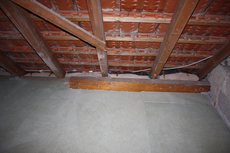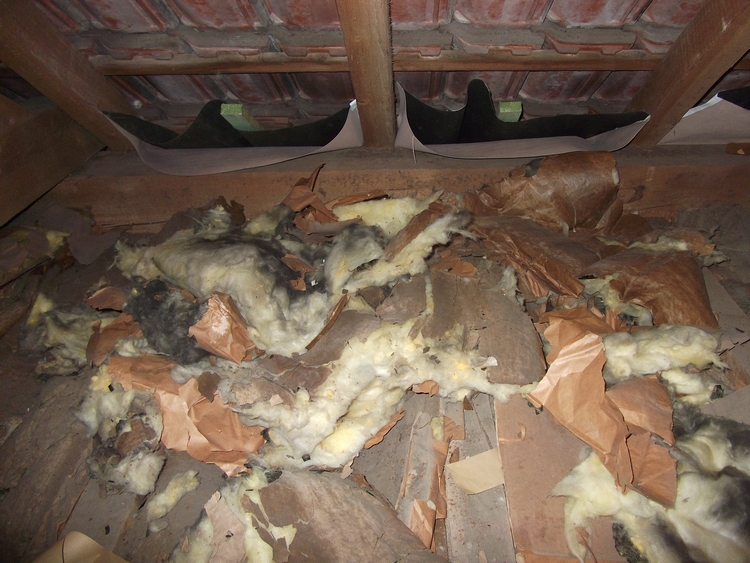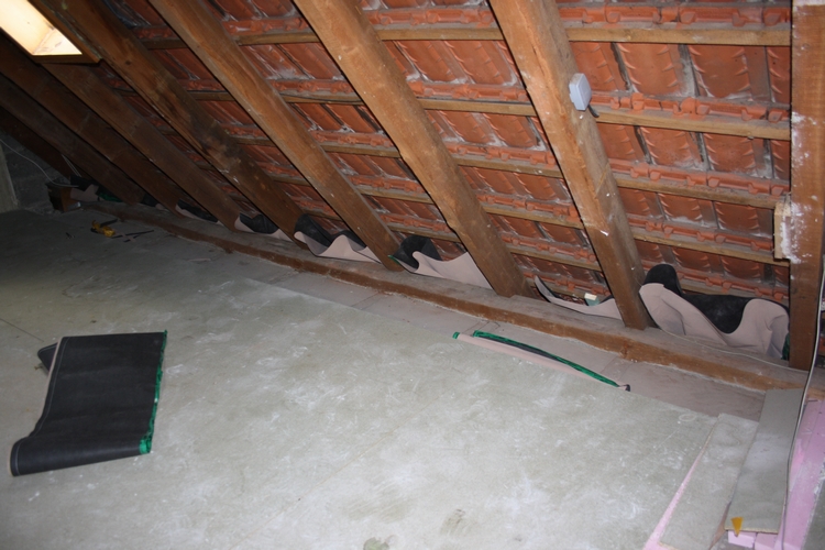 - Die Gefache müssen leer sein. Nicht nur der alte Dämmstoff muß entfernt werden. Manchmal entsorgen Dachdecker während ihrer Arbeiten einen Teil ihres Mülls in den Schrägen. Manchmal finden wir Gipserlatten vor, die über die oberste Geschoßdecke in die Dachschräge reichen. Die Gefache müssen dann zuerst mal „frei gemacht“ werden.