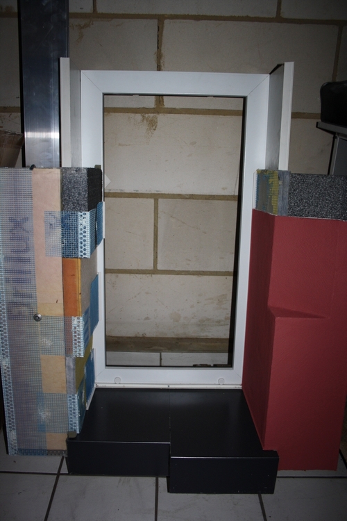 Musterfenster: Anhand dieses Musterfensters wollen wir die unterschiedliche Leistungsfähigkeit der Dämmstoffe demonstrieren. Auf der (von der Betrachterseite) linken Seite von oben nach unten EPS (WLZ 032), Phenolharz (WLZ 022) und Spaceloft (WLZ 014). Alle 3 Dämmstoffe wurden auf die gleiche Dämmwirkung angelegt. Mann kann deutlich erkennen, daß man nach Auftragen des Armierungsputzes und des Edelputzes bei dem EPS-Dämmstoff in die Glasfäche kommen würde. Mit Phenolharz bliebe man deutlich darunter. Mit Spaceloftdämmstoff hat man kaum Putzverlust und auch der Lichteinfall bleibt beinahe gleich. Auf der rechten Seite kann man die optischen Vorteile einer Abschrägung des Dämmstoffs erkennen. Würde das Fenster bei einer herkömmliche Dämmung extrem tief sitzen, wird die Schräge optisch der Wandfläche zugerechnet und die Fenster liegen so tief wie zuvor. Bei abgeschrägten Ecken ist auch der Lichteinfall deutlich größer. Auch die Fensterbank kann kleiner ausfallen. | |