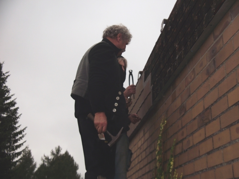 Damit der Dachhohlraum bis zum Rand mit (Zellulose)Dämmstoff verfüllt werden kann, werden 50 mm Mineralwolldämmstoffplatten in die Dachseite "geklemmt" und dann der restliche Dämmstoff eingeblasen. So ist vor dem Verschließen der Dachseite kein Herausfallen des Dämmstoffs möglich und das Dach ist bis zum Rand gedämmt. |