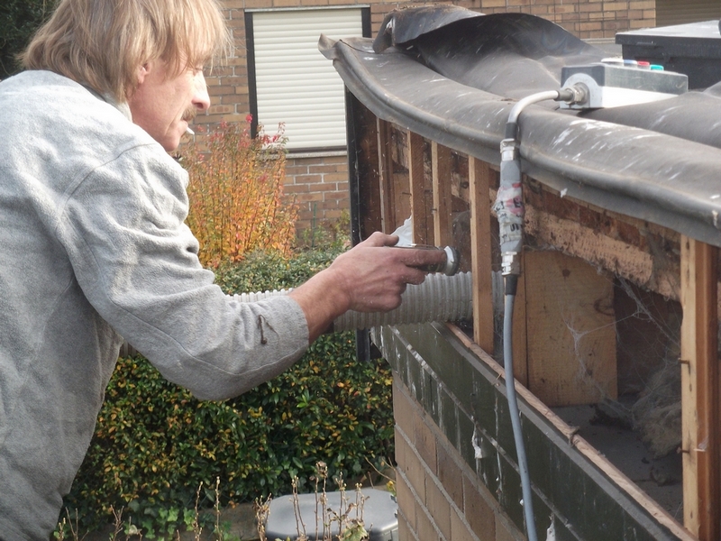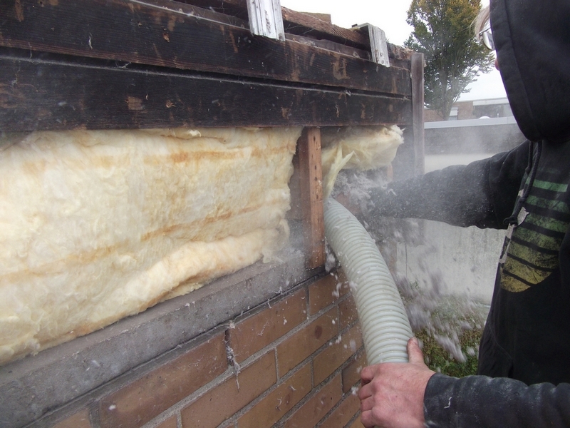 Die Mitarbeiter der Fa. Vesta öffnen das Dach von der Seite, indem die Verkleidung sowie die darunter liegende Holzkonstruktion entfernt wird (siehe Foto oben). Dann blasen wir in den Dachhohlraum einen Dämmstoff Ihrer Wahl (vgl. die beiden nachfolgenden Fotos). Dazu kommen folgende Dämmstoffe in Frage: Zellulose oder Holzfaser. Diese beiden Dämmstoffe haben einen hohen sommerlichen Hitzeschutz. Außerdem können Steinwolle oder Knauf Supafil verwendet werden. Die beiden letztgenannten sind unbrennbar und Knauf Supafil hat bessere Dämmeigenschaften gegen Kälte als die 3 anderen Materialien.