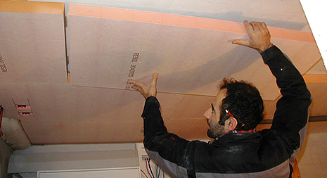 Ist die Kellerdecke niedrig, verwenden wir Hochleistungsdämmstoffe wie Phenolharz (WLZ 022) oder Spaceloft (WLZ 014). Phenolharz hat bspw. eine um 50 – 60 % bessere Dämmwirkung als EPS-Dämmstoffe. Die Dämmstärke kann also um mindestens 50 % (z.B. anstatt 12 cm nunmehr 8 cm) geringer ausfallen. Auch hier gilt für die Verklebung, daß diese zur Erreichung einer guten Dämmleistung möglichst mit dem Zahnspachtel und vollflächig erfolgen soll.