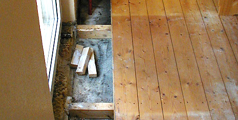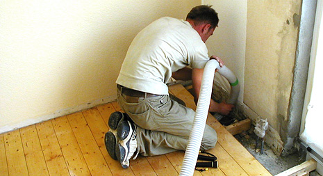 Wenn ein Kunde uns wegen einer Kellerdeckendämmung anruft und wir die Baustelle besichtigen, schauen wir uns aber immer auch die Räume im Erdgeschoß an. Oftmals befindet sich dort ein Holzboden, der auf einer Holzkonstruktion befestigt ist. Der Raum zwischen dieser (Holzbalken)unterkonstruktion weist meist eine Höhe von meist 6 bis 12 cm auf. Wenn er nicht mit Schlacke oder ähnlichem verfüllt ist, ist dieser Hohlraum groß genug für eine Einblasdämmung mit einem Dämmstoff Ihrer Wahl (Zellulose, Steinwolle, Knauf supafil oder EPS-Granulat). Um den Dämmstoff einzublasen, werden entweder Holzdielen am Rand aufgenommen/demontiert oder es werden Einblaslöcher in den Boden gebohrt. In einigen Fällen können diese Einblaslöcher auch von unten gebohrt werden. Diese Art der Kellerdeckendämmung ist die günstigste Möglichkeit der Kellerdeckendämmung überhaupt.und rechnet sich durch eingesparte Energiekosten innerhalb von 5 bis 8 Jahren.