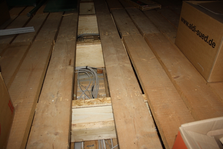 Wenn jedoch über dem Dämmstoff ein Boden eingebaut wird, verhindert dieser Boden diese Abtrocknung. Feuchtigkeit reichert sich im Dämmstoff an. Die Dämmleistung vermindert sich, der Dämmstoff schimmelt und am Ende durchfeuchtet der nasse Dämmstoff Sparren und Zimmerdecke. Dann muß aufwendig renoviert werden und das wird teuer. Daher muß bei einer Holzbalkendecke eine Dampfbremse eingebaut werden, die den Feuchteeintrag im Dämmstoff verhindert. Alternativ dazu kann der Bodenbelag über der Dämmung mit Löchern versehen werden. Bei Betondecken muß vor Ort entschieden werden, ob eine Dampfbremse eingebaut werden muß. I.d.R. ist dies nicht der Fall.